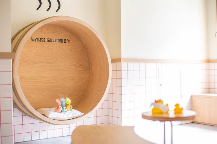 本格チーズスイーツをお楽しみいただけるチーズケーキファクトリー「熱海ミルチーズ」は、熱海温泉の魅力を「もっと多くの若い人にも知ってもらい」「熱海を再びスイーツで盛り上げたい」という想いから立ち上がり、熱海温泉をテーマにした創作チーズケーキを販売しています。クリームチーズとマスカルポーネチーズを使用した濃厚でふわっと軽い口どけの「風呂まーじゅケーキ」、牛乳瓶に入ったチーズケーキ「ミルチーズ」、求肥を手ぬぐいに見立て、プリンがお風呂に入っているかのような「桶プリン」など、ユニークなチーズケーキが勢ぞろいしています。