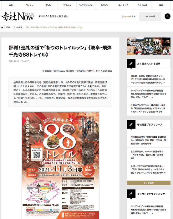 一般社団法人全国寺社観光協会(本部:大阪府大阪市)は、WEBメディア『寺社Nowオンライン』にて、海抜900メートルの袈裟山に広がる飛騨千光寺(岐阜県高山市)境内で年に1回開催されている「飛騨千光寺88トレイル」に関する、雑誌『寺社Now』掲載記事を公開しましたのでお知らせします。