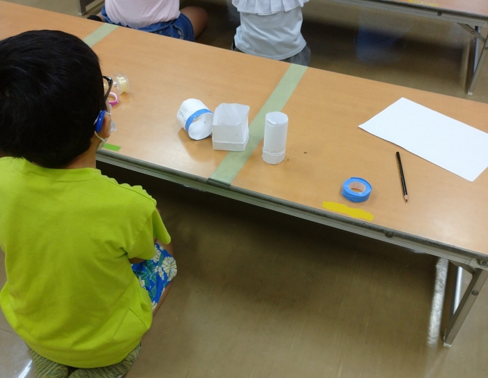 完成した飛行物体を校庭や体育館、プレイルームでテスト飛行をし、遠くに飛ばせなかった子どもも宮内先生のアドバイスを受けて無事にテスト飛行に成功。更に遠くに飛ばす為の工夫について宮内先生からレクチャーを受けて再度製作し、30m以上も飛ばせる子どももいました。