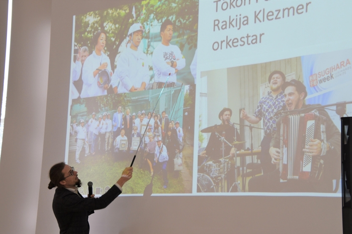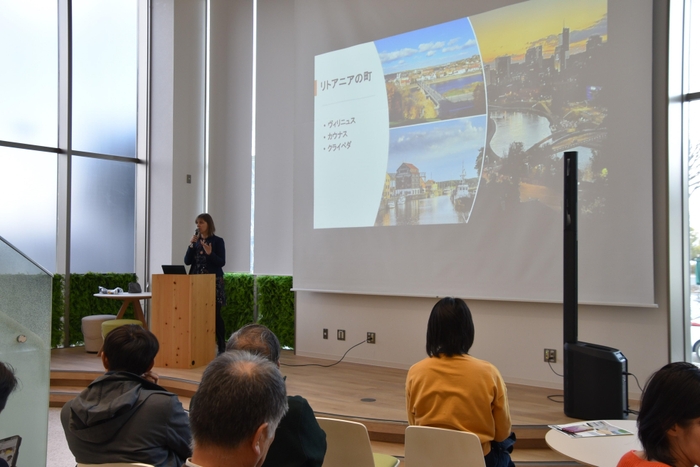 シモナさんは、福沢諭吉が文久遣欧使節の一員として1892年にカウナス駅を訪れて周辺を散歩したことを記録していることや、日露戦争終結後の1906年に日本についてリトアニア語で書かれた初めての本が出版されたことなどを説明。アルヴィダスさんは、日本とリトアニアの友好を深めようとリトアニアで開催されている「杉原ウイーク」などの杉原千畝関連のイベントなどを紹介しました。