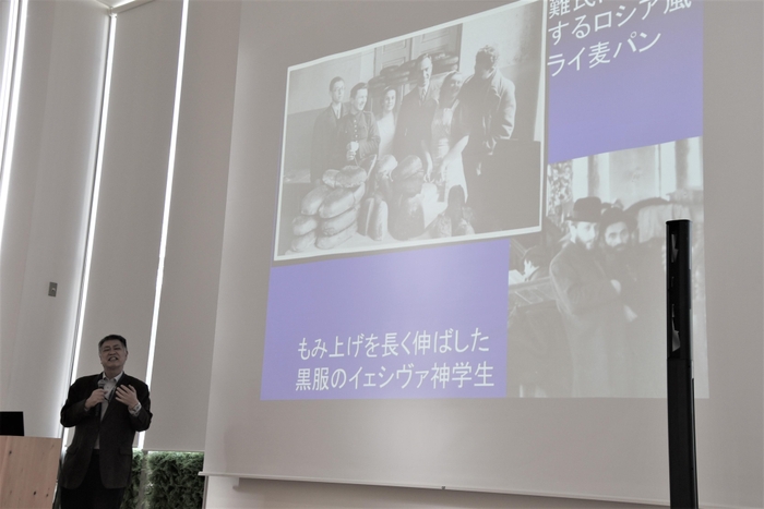 稲葉教授は「杉原だけでは難民を救えない リトアニアの貢献」と題して、ユダヤ難民に当時のリトアニアがどのような支援をしたのかを解説。リトアニアに逃れたユダヤ難民約3万人のために難民キャンプ6か所を設け、食料や衣服、医療などを提供したことや、パスポートの代わりに「安全通行証」を発行したことを説明し、稲葉教授は「だからこそ千畝は『命のビザ』を発給することができた」と力を込めました。