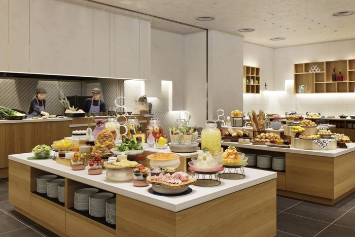 和洋食のビュッフェスタイルで提供します。大阪の食文化を語る上で欠かせない、ねぎ焼きやうどんなどの「粉もん」や、旨味のカギとなる「出汁」を楽しむことができます。削りたての鰹節からふわりと漂ういい香り、ねぎ焼を鉄板で焼くときの「ジュ~」という音など、ライブ感あふれる演出にこだわりました。