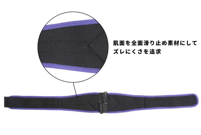 肌面を全面滑り止め素材にしてズレにくさを追求しました。立つ・座るだけでなく、頻繁に繰り返す荷物運びやスポーツ時など、さまざまなシーンでもズレを気にせず腰をサポートします。