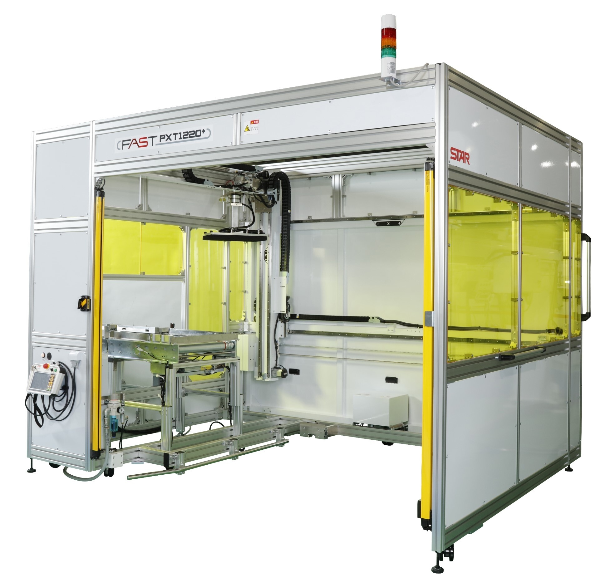 現行「PXT-1220」標準仕様では、パレットサイズはT11型のみですが、「PXT-1220+」では、T11型~T14型までが、標準対応となります。安全カバーと引き込みコンベア一体型となっているため、導入が容易です。
