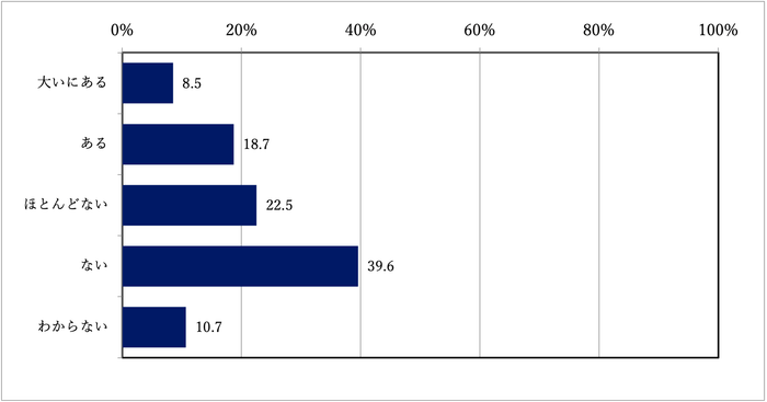 62.1%(598名)の人が、「ほとんどない」、「ない」と回答。(「ない」と回答した人は39.6%(381名)と一番多い。)ただ、「大いにある」、「ある」と答えた人が4人に1人以上(27.2% 262名)と眉に関してお悩みを持つ男性も少なくないことがわかった。