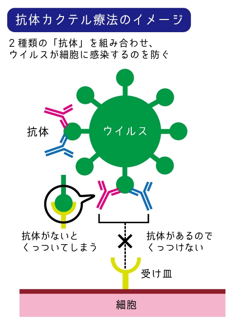 投与された2種類の抗体はウイルスの表面にある突起部分「スパイクたんぱく質」に結合し、細胞への侵入を阻害して増殖を防ぎます。異なる抗体を投与することで、変異ウイルスにも対応できると期待されています。