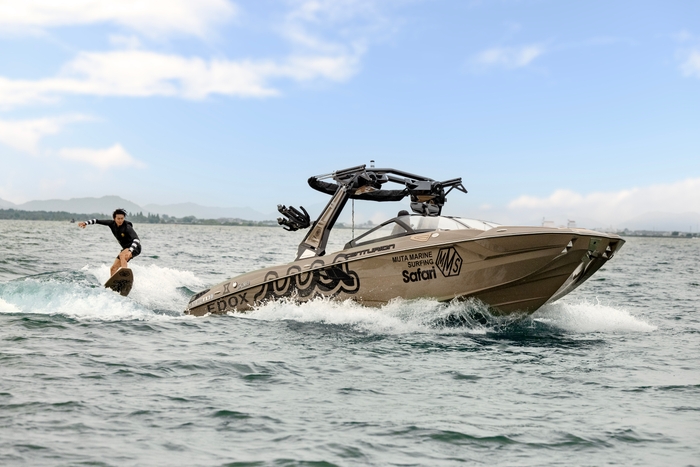 本限定モデルの発売にあたり、マリンアクティビティーのウェイクサーフィンを通してイメージ撮影を実施しました。米国カリフォルニア発のウェイクサーフィン専用ボートである「センチュリオン ボート」のムータデザインモデルに、エドックスのロゴを加え、本コラボのプロモーションを行なっていただきました。