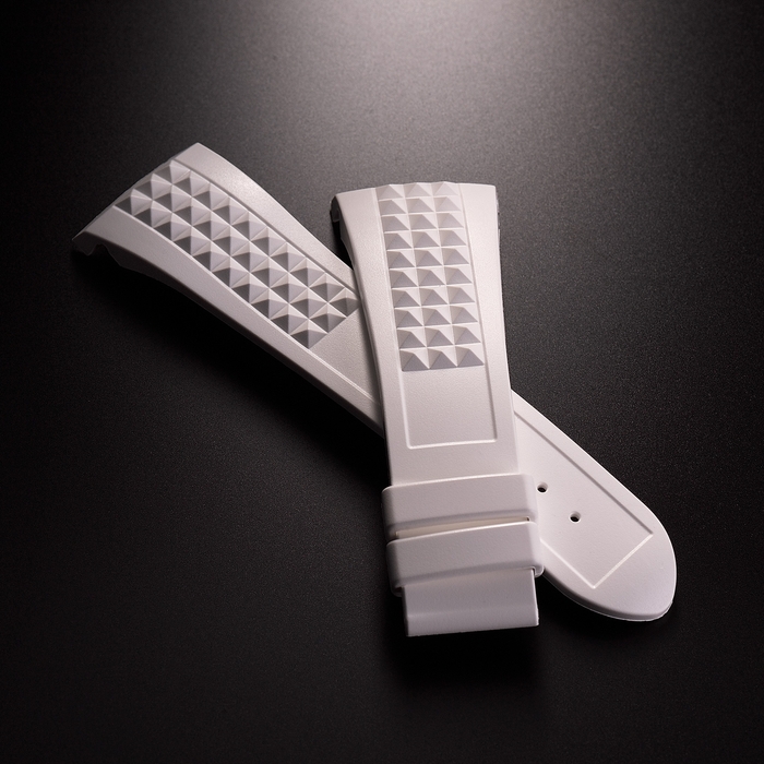 エッジの効いたシャープなラグに、柔らかく腕馴染みの良い、耐久性に優れたシリコン配合のラバーストラップを接続。装着時に、ストラップが腕に沿った丸みのあるシルエットになるように、ストラップを横方向ではなく下方向に取り付けています。
