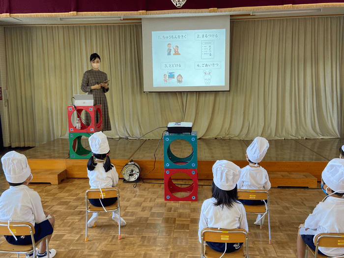 幼稚園・保育園への出前授業では、一般社会で必要とされる力(マナー)を言葉遣い・挨拶・立ち振る舞いをわかりやすく説明しています。また、レストランでの接客体験を通じて、挨拶やオーダー受付、飲み物の提供などの疑似体験を行っています。