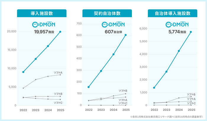 株式会社東京商工リサーチが2025年1月に実施した「SaaS型業務支援システムの導入園調査 2024」で、株式会社コドモン(本社:東京都港区、代表取締役:小池義則)の展開する保育・教育施設向けICTサービス「CoDMON」(以下:コドモン)が、3部門において6年連続NO.1の結果となったことをお知らせします。