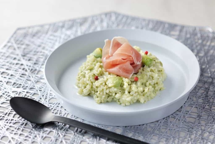 ジェノベーゼソースをベースにクリーミーなアボカドと生ハムの旨味を加えて仕立てたリゾット。