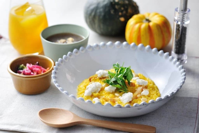 かぼちゃベースのリゾットにリコッタの風味、松の実の食感、ベーコンの旨味を合わせたリゾット。