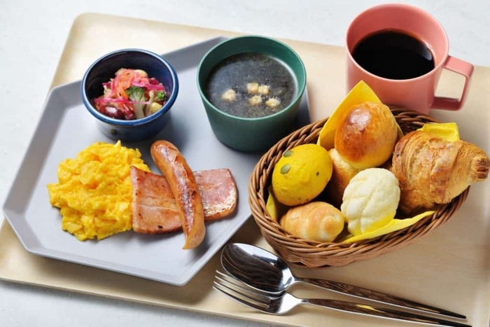 朝はパン派という方には、フォカッチャやクロワッサンなど5種類のパンと、厚切りベーコンやふわふわのスクランブルエッグがセットになった「アメリカンブレックファースト」がおすすめ。ほっとあたたまるスープや、酸味のあるキャロットラペが新しくセットの仲間入り。焼きたてのパンと挽きたてのコーヒーの香りで、朝の気分をリフレッシュしましょう。
