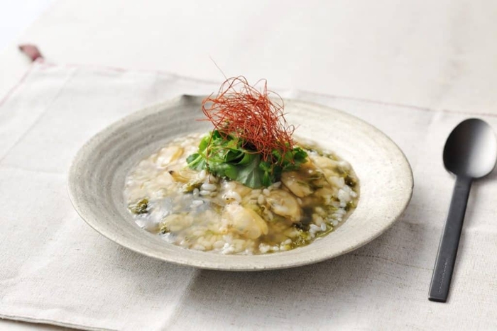 貝出汁にあおさ海苔を加えた和リゾット。東京名物の深川めしをイメージしあさりやねぎを加えています。