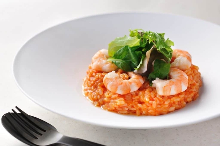 トマトソースに出汁を使用しさっぱりと仕上げたリゾット。洋の味わいの中にふわっと和が広がります。