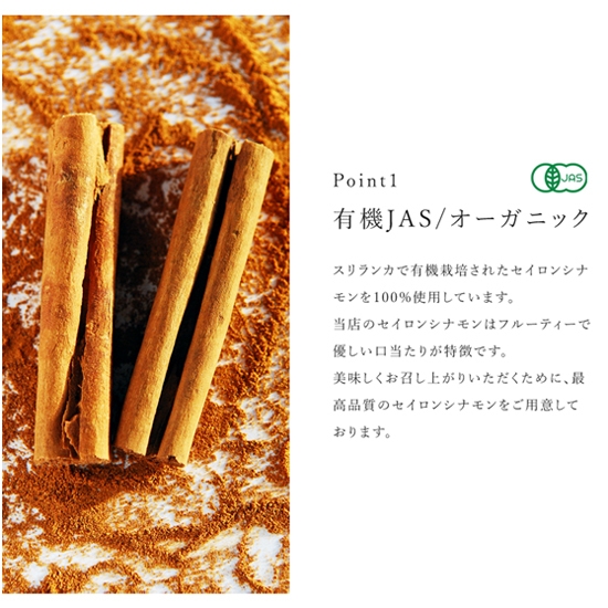 100%オーガニックのセイロンシナモンを使用し、上品で繊細、爽やかでフルーティーな香りが楽しめます。ヨーグルトに加えると、砂糖なしでも美味しくいただけます。お料理やお菓子作りにも最適で、仕上げの直前に加えると上品さが一層引き立ちます。お茶や料理に幅広く使用でき、多彩な楽しみ方が可能です。