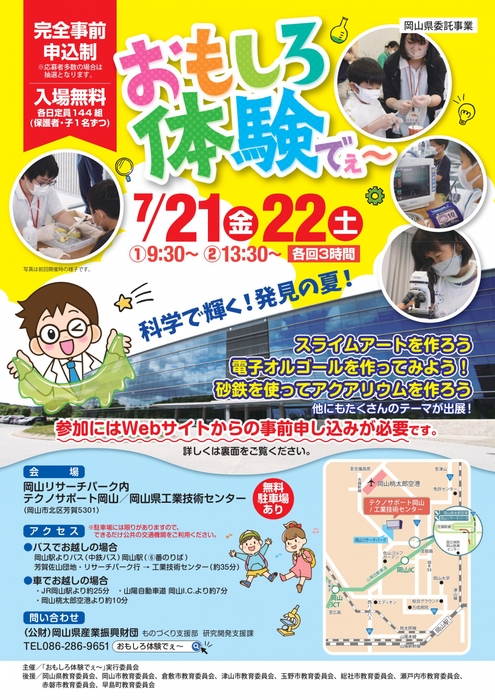 「おもしろ体験でぇ~」実行委員会では、県内のものづくりを支える拠点施設が集まっている「岡山リサーチパーク」を県民の皆さん、特に未来を担う子どもたちに一般公開し、科学技術やものづくりの素晴らしさを体験してもらう事を目的に毎年「おもしろ体験でぇ~」を開催しており、本学が参加しますので、ご紹介します。