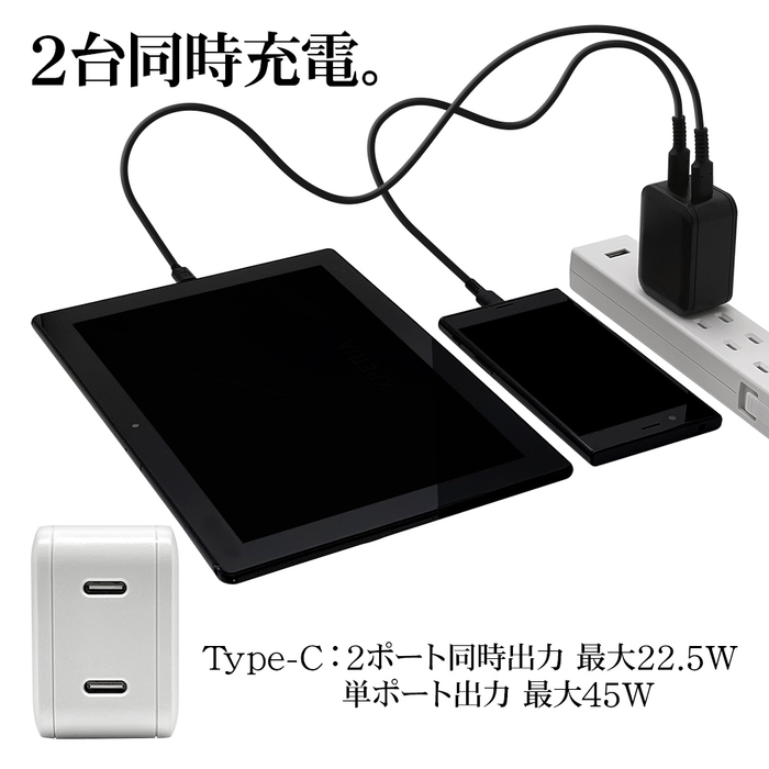 Type-Cポート×2が搭載されており、iPhoneやスマートフォン、iPad、タブレット等を最大2台同時に充電する事が可能です。