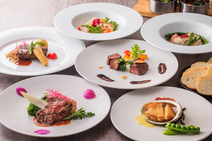 ダイニングでのお料理は、地元の新鮮な海山の幸を取り入れたブッフェスタイルで、四季の恵みをお楽しみいただけます。メインディッシュは料理人が目の前で仕上げるライブキッチンで出来立ての料理をコース料理の一品のように盛り付けご提供いたします。ディナータイムは18:00~23:00(ラストオーダー21:00)とゆとりのある時間と、座席数も十分にご用意しておりますので、ゆっくりとお食事やご歓談をお楽しみいただくことができます。