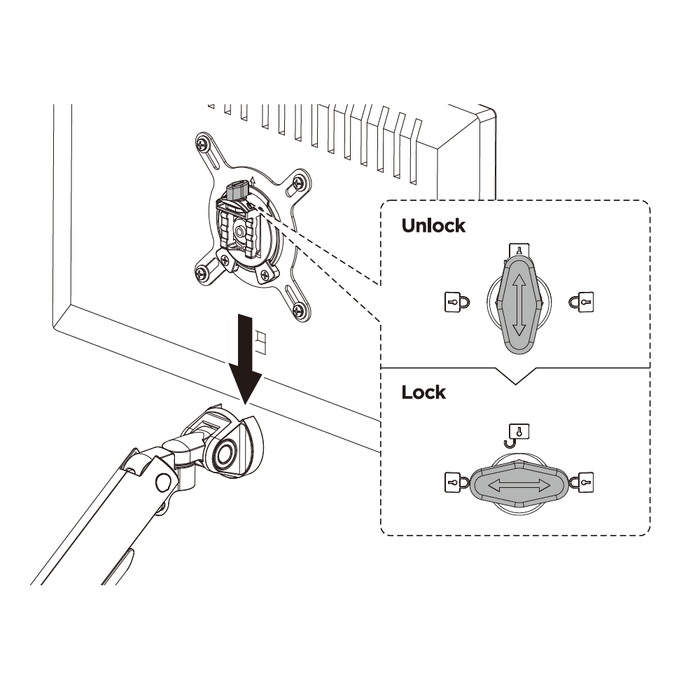 クイックリリース(VESA規格100mm、75mm)を採用しており、モニター使用時には外れないようにロック、モニターを外す時にはアンロックにすると簡単にモニターの脱着ができるようになっています。さらに、液晶モニターアームの台座部分には、USB3.0延長ポート2口を搭載しています。