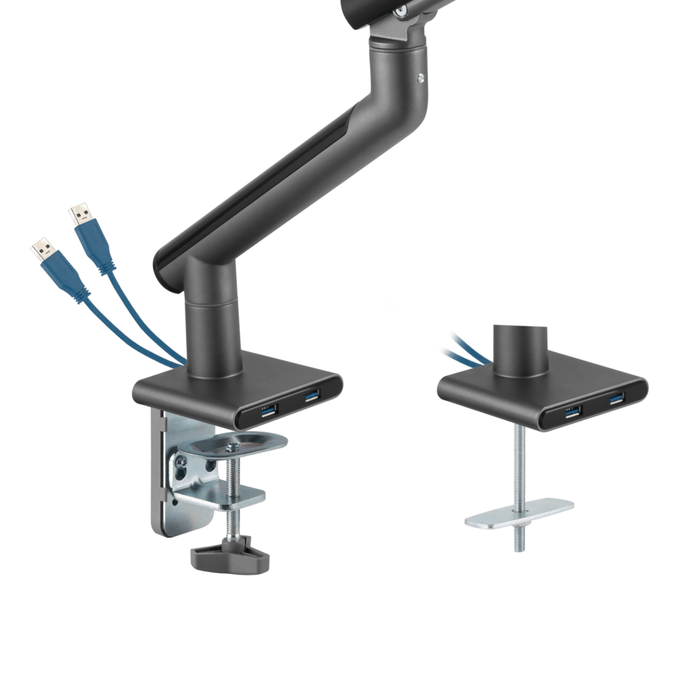 ユニットコム オリジナル『液晶モニターアーム』は、アルミ筐体・クイックリリースを採用し、USB3.0に対応したUSB延長ポートを2口搭載しています。17~32型・重量2~9kgまでのモニターに対応しており、取り付けはクランプ式またはグロメット式になります。見た目に高級感があり、クイックリリースやUSB延長ポートなど便利な機能を備えた、コスパに優れた液晶モニターアームです。