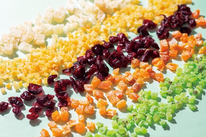 使用しているドライフルーツは甘味と酸味のバランス、そして見た目の華やかさにもこだわった、アプリコット・クランベリー・アップル・マンゴー・キウイの5種類です。この5種類のドライフルーツにさわやかな香りと味わいのレモンジュレを加え、一体感がでるよう仕上げています。