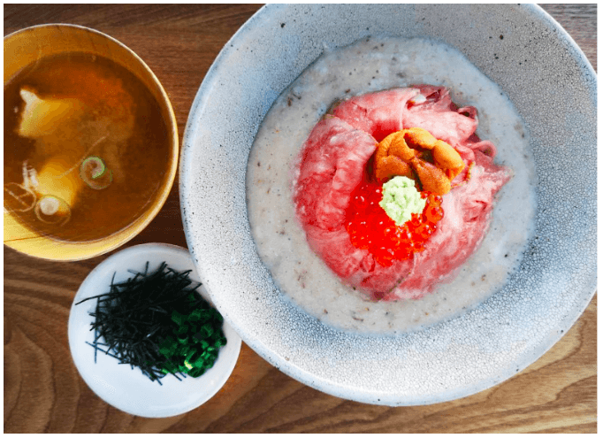 南足柄で育てられた「幻」の相州牛のローストビーフにウニ、いくら、とろろを組み合わせた海と山の幸の饗宴。とろけるようなウニとお肉の組み合わせの「うにく」と、自然薯に白味噌を加えた出汁を組み合わせた上品な味わいのとろろとの相性も抜群です。