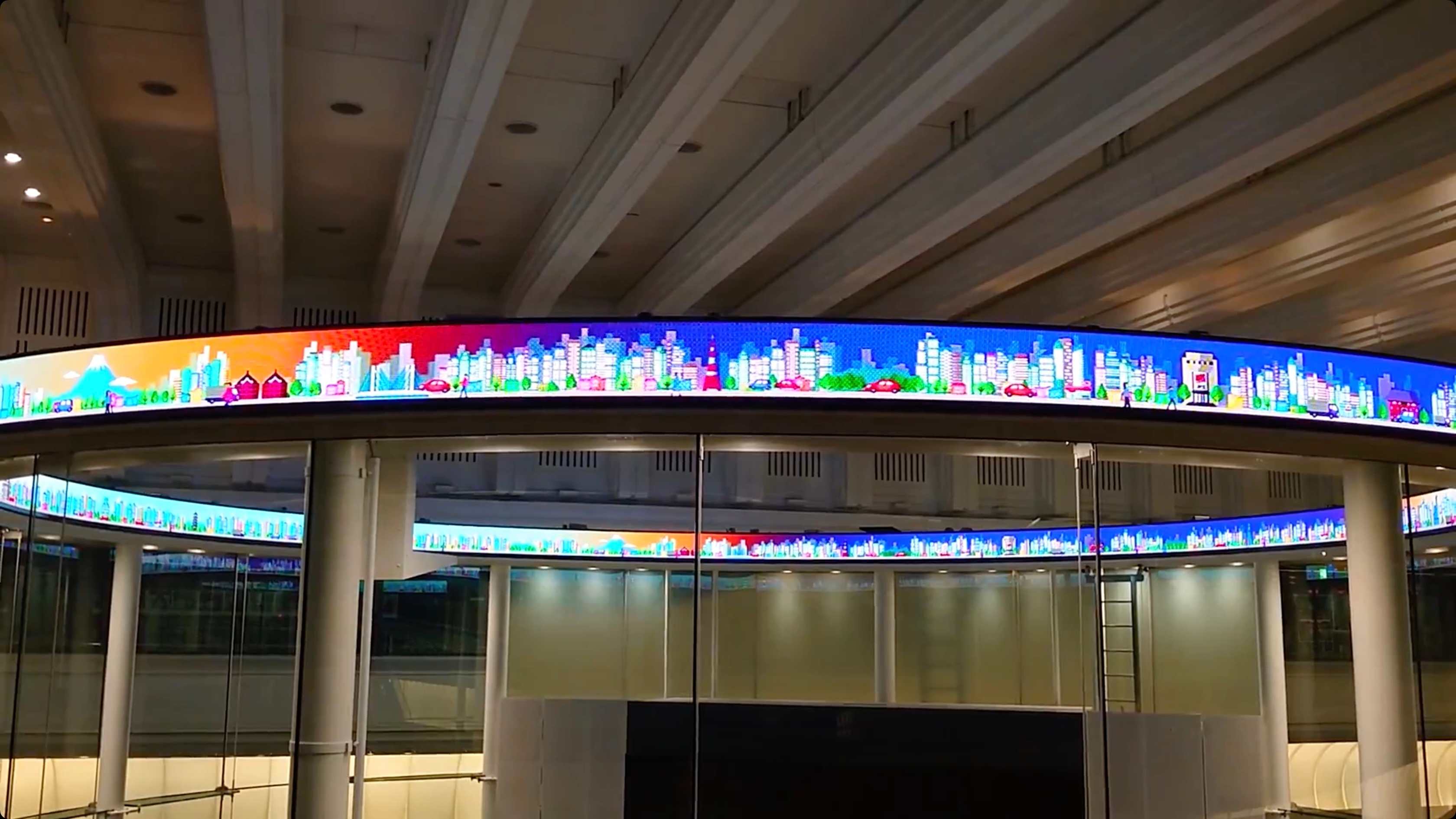 東急グループのイッツコムは、渋谷ヒカリエ(東急グループの複合商業施設)の地下エントランス空間に設けられた大型LEDリングサイネージのコンテンツ運用等を行っており、そのスキルをこの東京証券取引所のリング状大型LED「チッカー」にも活用しています。