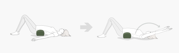 膝を立てた状態で、本商品の上に寝転がります。ゆっくりと腕を上げていき、頭の後ろまで反らします。これにより背中まわりや上半身もしっかりストレッチできます。