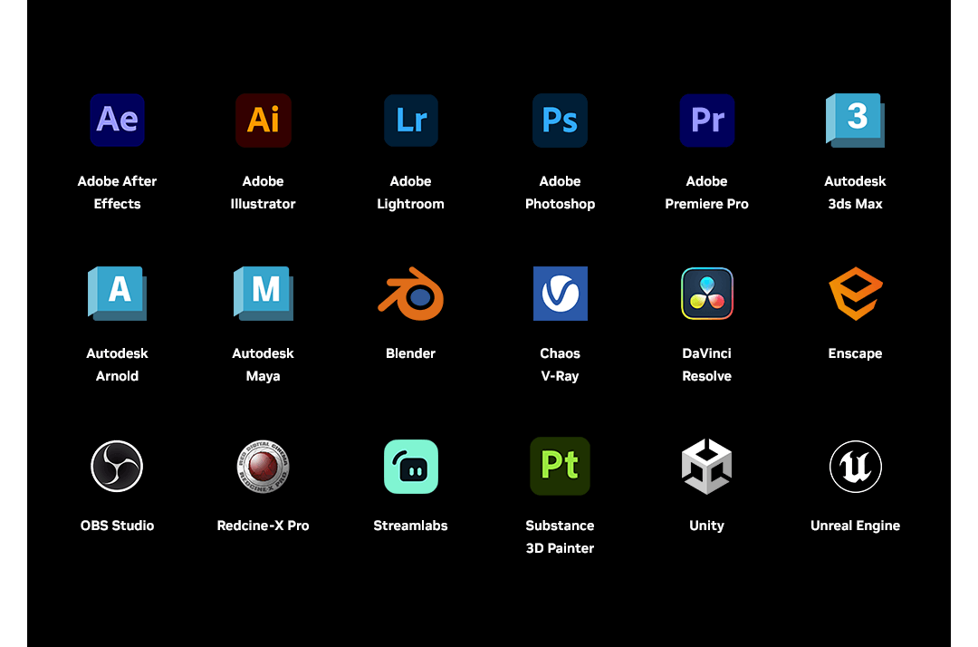 最高レベルの信頼性を実現するために、Studio ドライバーは、複数のアプリを使用するクリエイターのワークフローや、Adobe から Autodesk までのトップ クリエイティブ アプリケーションの複数のリビジョンに対して、徹底的なテストを受けています。