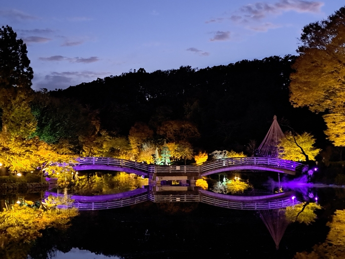 池の周りのカエデ類や隣接する薬師堂の大イチョウをライトアップします。たいこ橋や月が湖面に映る静かで幻想的な空間が楽しめる夜間特別開園です。風のない夜は霧の演出も予定しています。