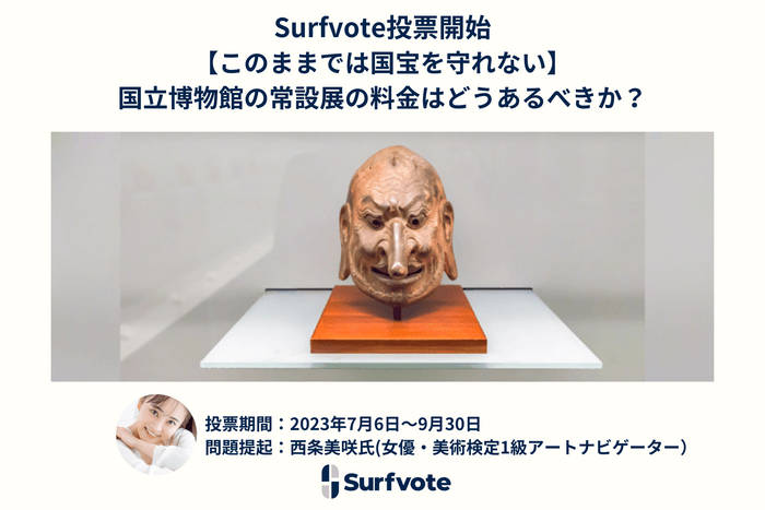 これに警笛を鳴らすのがSurfvoteオーサーの西条美咲さんです。西条さんは、女優としても活躍しながら美術検定1級を持っており、プライベートでも年間100以上の展示会に足を運ぶアートナビゲーターです。日本で最も歴史のある東京国立博物館が、予算確保の困難から文化財購入・修理費などの予算の一部をカット。この状況から西条さんは、予算確保の1つとして、私たちの国宝を守るために、博物館の入場料がどうあるべきなのか?ユーザーに問いかけています。Surfvoteでは9月30日までこのイシュー(課題)について投票を募集しています。