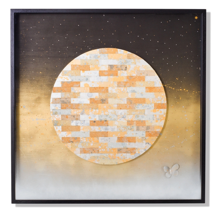 描かれている蝶には、“バタフライ・エフェクト”(蝶の羽ばたきは地球の裏側のトルネードを引き起こす可能性があるというカオス理論)という言葉があるように、蝶が夢を思って活動し、やがて平和という渦ができることを願う、長坂自身の姿を重ねています。月シリーズの作品は、長坂の地元福井の越前和紙に、墨や金銀泥、クリスタルを重ねて描かれています。