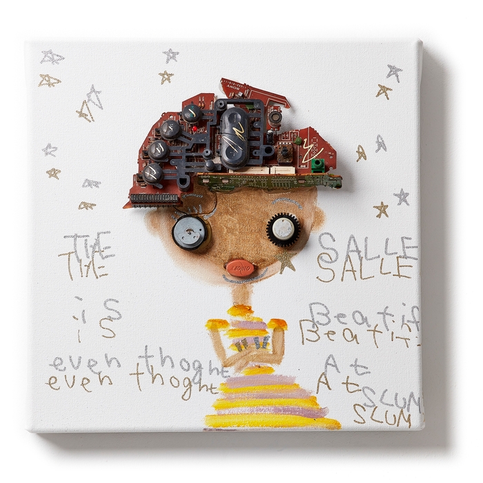 ゲーム機のコントローラーやテレビのリモコン、パソコンのマウスやキーボードなど現地のゴミをキャンバスに貼り付け、油絵を施す。