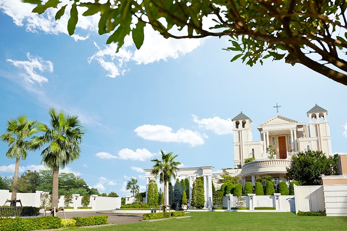 大パノラマで海を望む「天空のチャペル」と、ステンドグラスが美しい「セントアンドリュース教会」の2つのチャペルと、趣の異なる6つの貸切邸宅(パーティー会場)を有し、すべての邸宅には自由に使える貸切のガーデンとテラス付き。