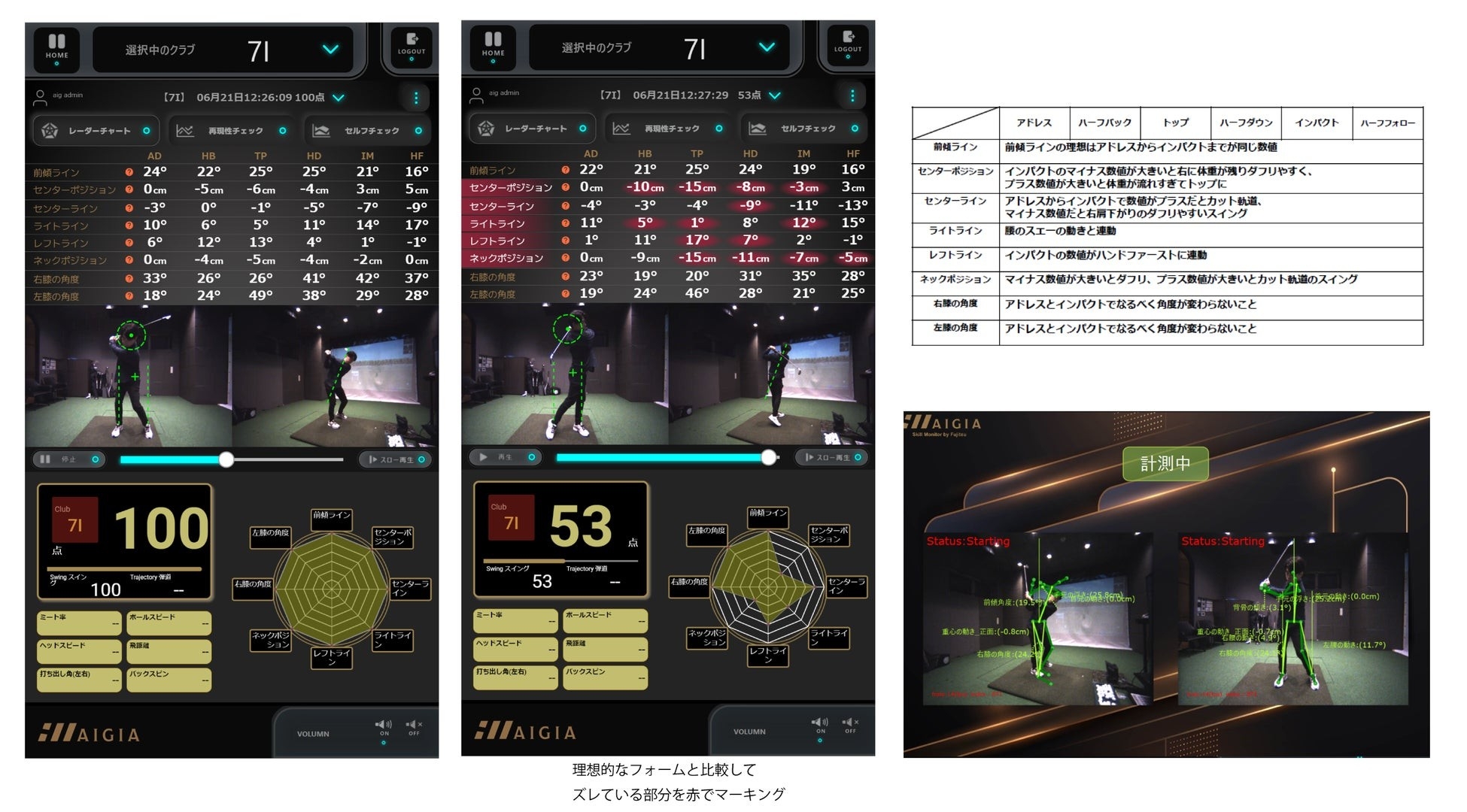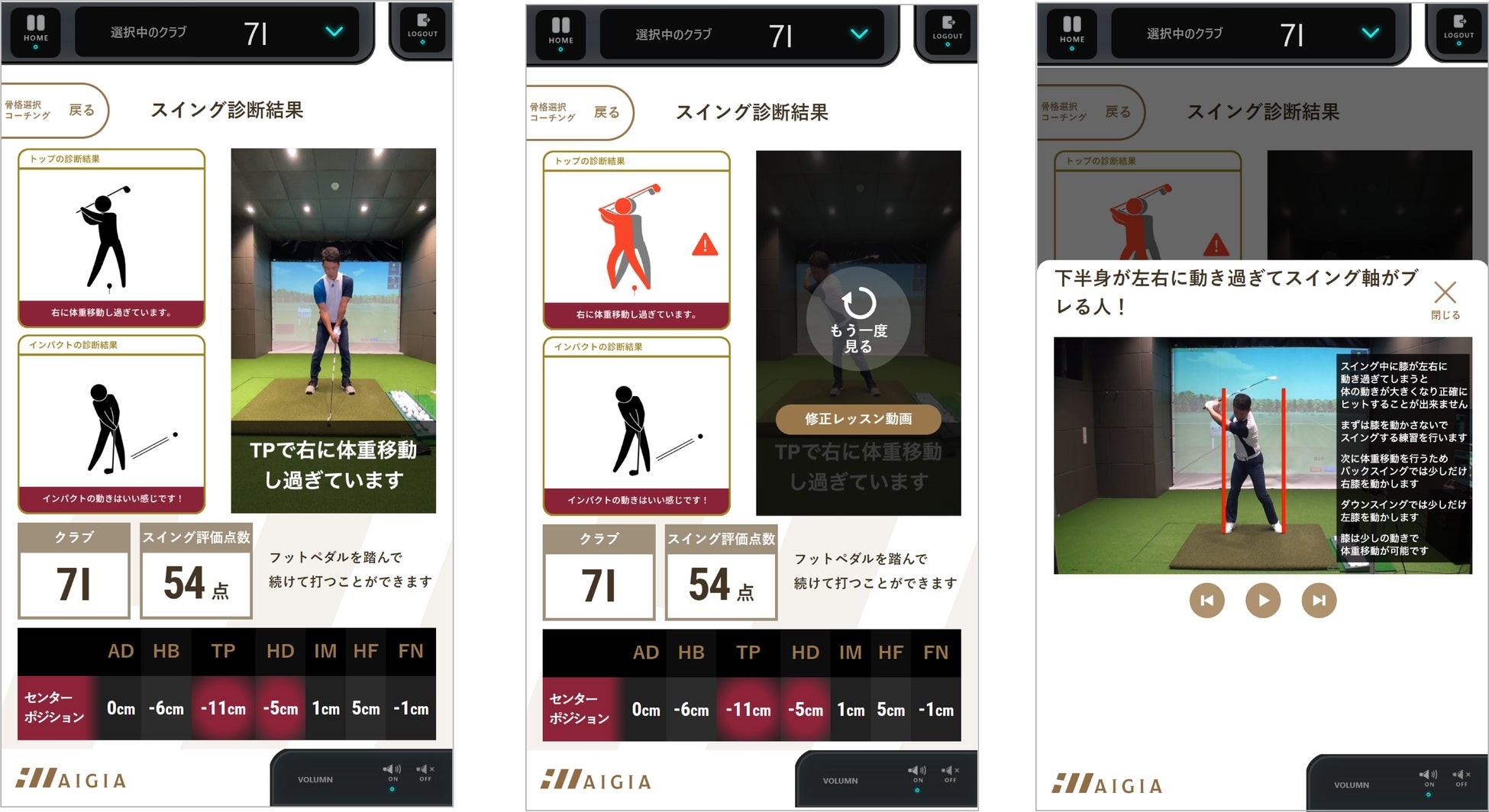 AIGIAは、初心者向け動画プログラムが充実、中・上級者の方にはロジカルなスイング分析機能が再現性改善、完成度アップを目指した練習に最適な一台です。