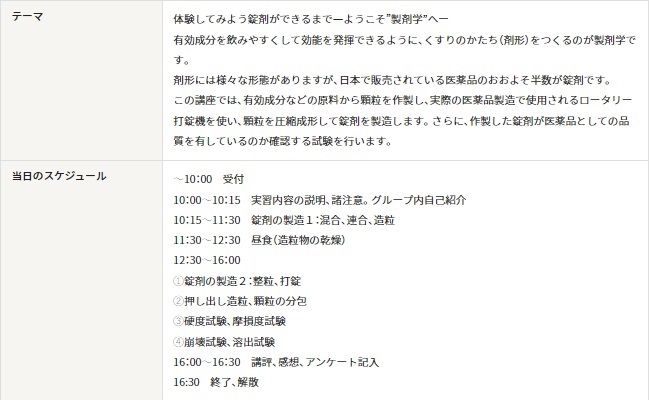7月20日(土)は製剤学研究室の丹羽敏幸教授と近藤啓太准教授が講師となり、有効成分などの原料から顆粒を作製し、錠剤を製造したり、品質の確認試験などを実施します。