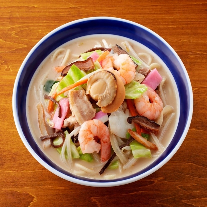 自社製醤油を使用し、店主監修のもと、お店の味を再現しました。豚骨ベースにかつおの風味が効いたスープは、うどん屋からスタートした伊万里ちゃんぽんならではの特徴です。さらに焼きあごを加え、後味に魚介のうまみを感じられるスープに仕上げました。にんにくと生姜の風味で、あっさりながらも具材に負けないスープです。