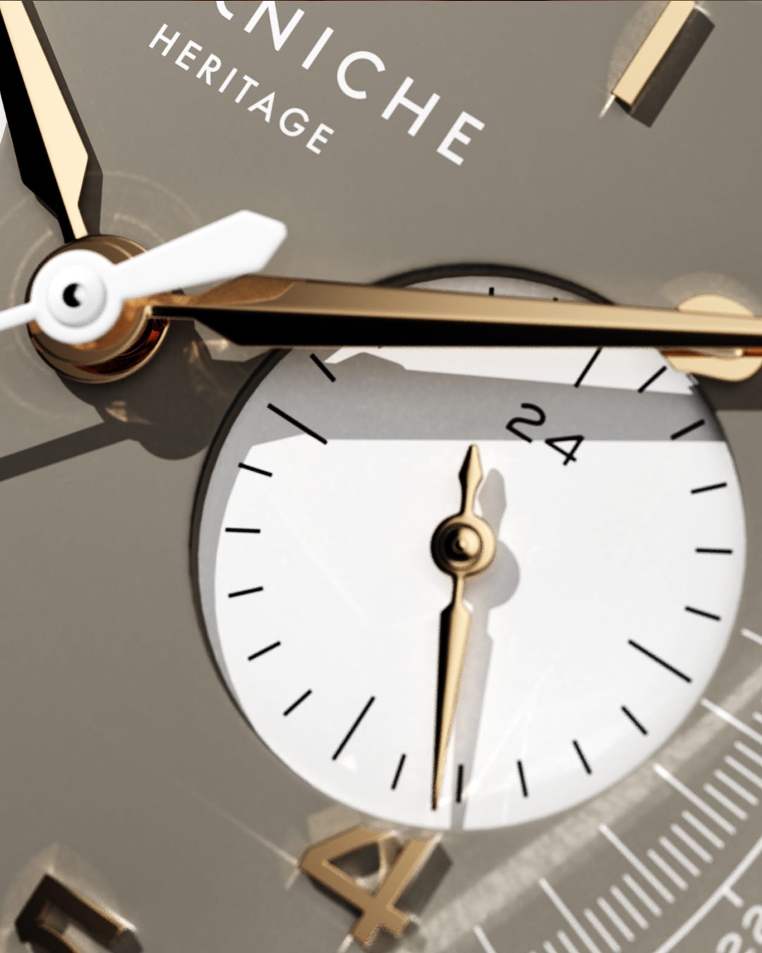 2021年に即完売した「Vert Militaire」に続く、ミリタリーシリーズ第2弾。洗練された“サンドベージュ×ローズゴールド”のコンビネーションが特徴的。フランスのリヴィエラ文化から着想を得たカラーリングと、モダンかつクラシカルな造形が融合し、上品なミリタリーデザインを再解釈したモデルです。ケースは39mmの316Lステンレススチールを採用し、繊細なポリッシュ面とサテン面を組み合わせることで立体的なフォルムを強調。砂地を思わせるサンドベージュのダイヤルには、読み取りやすいアラビアインデックスとレイルウェイトラックを配置し、実用性とデザイン性を両立しています。ホワイトのサブダイヤルと外周のタキメータースケールが全体を引き締め、クラシックスポーツスタイルとしての存在感を際立たせています。