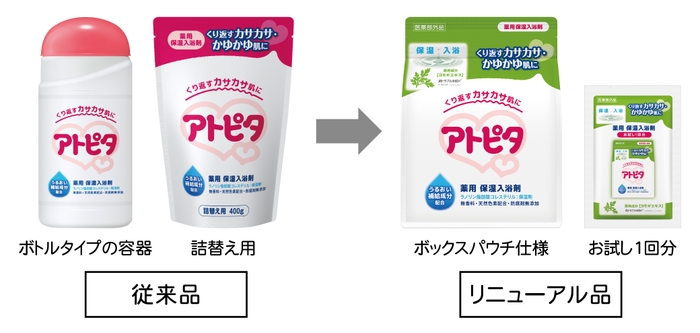 従来のボトルタイプの容器・詰め替え用から環境に配慮した「ボックスパウチ」へ変更しました。使用後の保管に便利なチャック付きで、付属のスプーンで計量もしやすくなりました。初めて入浴剤を手に取るお客様が手軽にお試しいただけるよう価格の見直しも行った他、『お試し1回分』を新発売。これまでよりも多くのお客様にアトピタの入浴剤の魅力を実感していただきやすくなりました。