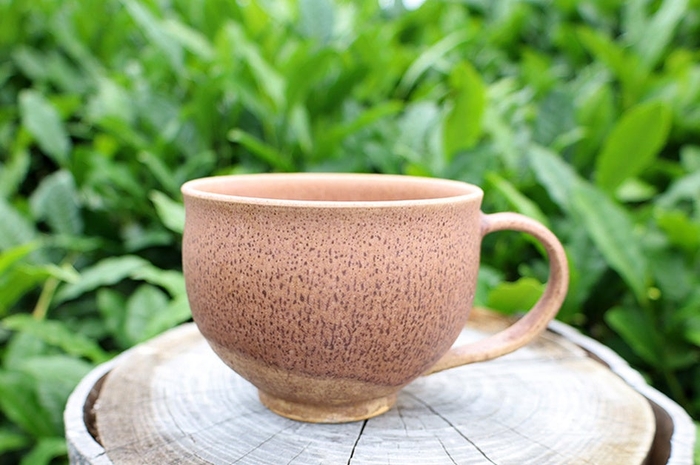 高級木材の紫檀のような赤褐色にしっとりとした手触りが特徴的なマグカップです。またマグカップの内側の釉薬が溜まった部分は、薄氷のような結晶が生まれ、キラキラしたテクスチャが見た目にも美しい表情を持っています。高級感や可憐さを意識して設計された釉薬が魅力の器となっております。