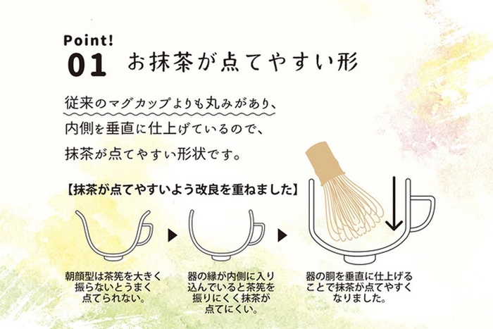 従来のマグカップよりも丸みがあり、内側を垂直に仕上げているので茶筅が振りやすく、取手には指が3本入るので安定して抹茶を点てることができます。器の縁は厚みをだし、口あたりが心地良い飲み口となっています。