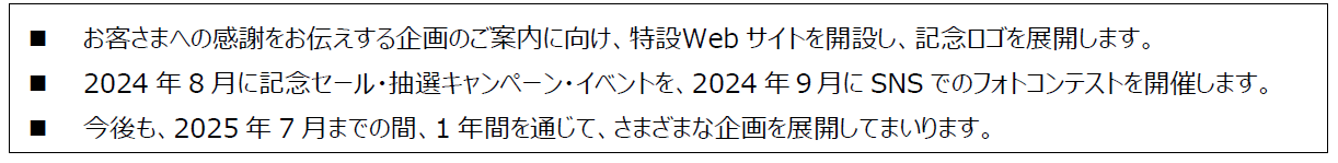 周年記念の取り組みのご案内を行う特設Webサイトを開設します。今後、キャンペーンなどのおトクな情報や、特別イベントの開催日程、客室乗務員の新制服の紹介や、社員からお客さまへの感謝の言葉などを掲載してまいります。