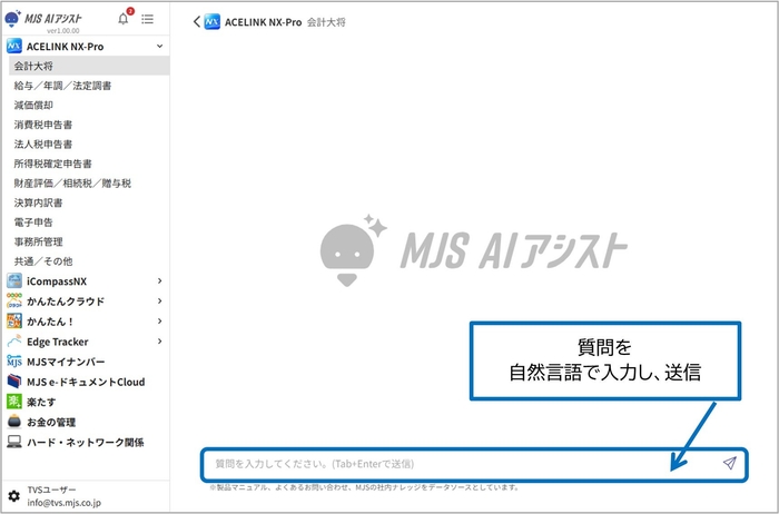 今後、「TVSサイト」以外に、会計事務所向けERP製品『ACELINK NX-Pro(エースリンク エヌエックスプロ)』から『MJS AIアシスト』を直接起動し、使い方などの疑問が生じた際によりスピーディーに自己解決できるようにしていきます(2025年9月予定)。さらに、本年度中には企業ユーザーのお客さまに対しても『MJS AIアシスト』を提供することで、より幅広いお客さまのスムーズな問題解決とお客さまへの付加価値向上に向け取り組んでまいります。
