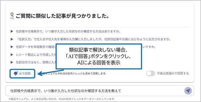 質問を入力すると類似するFAQ記事を選定し列挙。FAQで解決しない場合には、画面下部より「AIで回答」ボタンをクリックすることで、生成AIによる回答が表示されます。