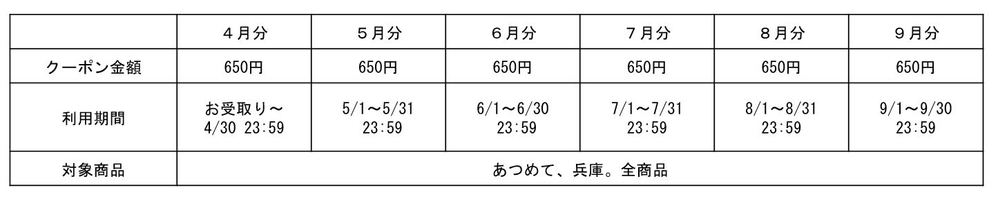 合計3,900円分のクーポンの利用期間は2023年4~9月で、各月650円分ずつご利用いただけます。ぜひこの機会に、当ショップでのお買い物をお楽しみください。
