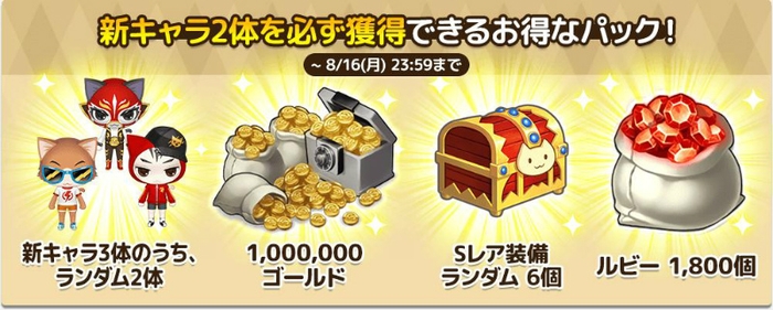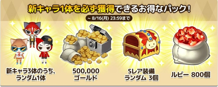 新キャラ登場を記念して、8月16日まで「新キャラ」を必ず獲得できるお得なパック3種を販売中!