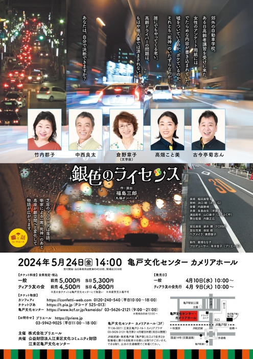 株式会社プリエール主催、噺と話 by プリエール『銀色のライセンス』が2024年5月24日 (金)に亀戸文化センター カメリアホール(東京都江東区亀戸2-19-1カメリアプラザ5F)にて上演されます。チケットはカンフェティ(運営:ロングランプランニング株式会社、東京都新宿区、代表取締役:榑松 大剛)にて2024年4月10日(水) 10:00 予約受付開始です。
