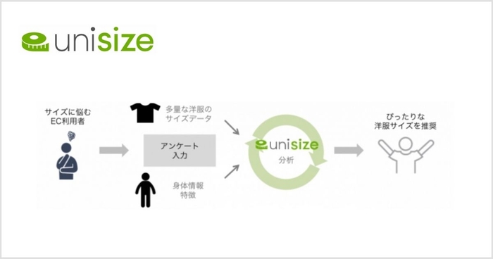 unisize(https://cl.unisize.makip.co.jp/)はネットで洋服を買うときに、より身体に合ったサイズを推奨するレコメンドエンジンです。機械学習アルゴリズム(AI)を用い、お手持ちのスマートフォン端末で撮影した正面と側面の全身写真から、腕の長さや肩幅などの体型を採寸します。従来のような専門知識やメジャーを用いて採寸するような手間をかけずとも、自分に合うおすすめサイズを確認できます。また、過去に買った洋服と比較する購入履歴比較機能なども併設し、ユーザーの持つ情報に合わせてサイズを確認することができます(※特許取得)