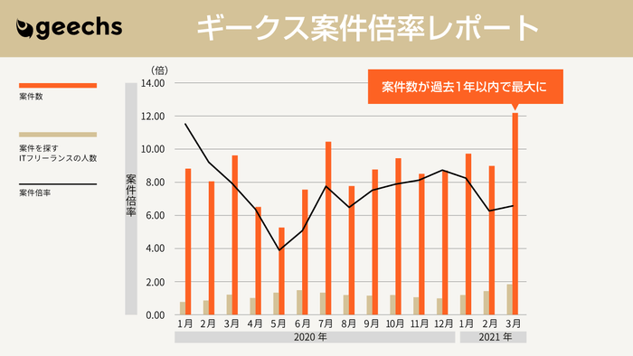 ITフリーランス市場における需給トレンドを表す「ギークス案件倍率レポート」 2021年3月の案件数が過去1年間で最大に、案件倍率は6.57倍